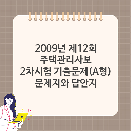 2009년 제12회 주택관리사보 1차시험 기출문제(A형) 문제지와 답안지입니다. 주택관리사보 자격시험 준비에 참고하시기 바랍니다. 아래에서 다운 받으실 수 있습니다. 주택관리사보 자격시험 문제지 다운받기▶ 주택관리사보 자격시험 답안지 다운받기▶       주택관리사보는 주택관리업에 종사하는 전문 인력으로, 주택이나 아파트 등 공동주택의 관리와 운영에 관한 업무를 수행하는 직무입니다. 주택관리사보는 주택관리사 자격증을 취득한 후, 주택관리 관련 업무를 담당하게 됩니다.주요 업무시설 관리: 공동주택의 시설 및 기계 설비를 점검하고 유지보수하는 업무를 수행합니다. 재무 관리: 관리비 수입 및 지출을 관리하고, 예산을 수립하며 회계 업무를 수행합니다. 입주자 관리: 입주자와의 소통을 통해 불편 사항을 해결하고,..